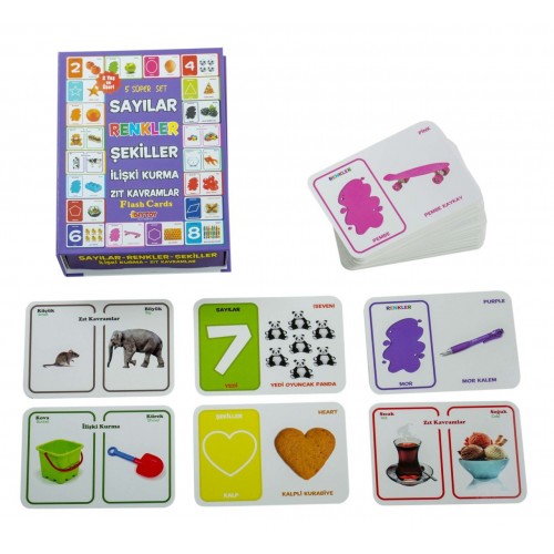 2 yaş ve üzeri çocuklar için hazırlanmış çok eğlenceli eğitim seti. Eğitici Oyuncaklar Sayılar Renkler Şekiller İlişki Kurma Kartları ile sayılar,  renkleri, şekilleri, ilişki kurmayı ve zıt kavramları öğrenecekler. Arkalı önlü kart görselleri sayesinde çocuklar istedikleri kartı seçecekler ve  üzerinde bulunan görselin ne olduğunu ve ne işe yaradığı öğrenebilecekler. Çocukların konuşmaya başladıkları dönemde ki ilk olarak tanıyacakları nesneleri  barındıran, Sayılar Renkler Şekiller İlişki Kurma Kartları ile  çocuklar günlük yaşamda ki kelimeleri eğlenerek öğrenecekler. Kitap şeklindeki kutusu sayesinde çocuklar Sayılar Renkler  Şekiller İlişki Kurma Kartları istedikleri yere kolayca götürebilecekler. Çocuklar kartlar sayesinde kelime ve bilgi dağarcıklarını geliştirecekler.