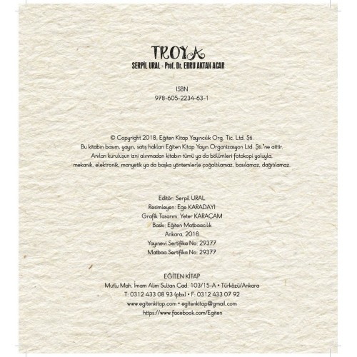 Bunca emekten sonra, onca öğretmenin, akademisyenin ve bir çocuk kitabı yazarının ortak çalışmasına kalıcılık kazandırmak istedik. Bundan sonraki kuşaklar da coğrafyamızda önemli bir yeri olan Troya’nın geçmişiyle daha küçük bir çocukken tanışsın istedik. Elinizdeki kitap okul öncesi ve ilköğretim dönemindeki çocuklarımız için bu amaçla resimlenip yayınlandı.