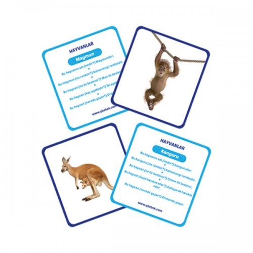 Tüm kartların ön yüzlerinde hayvan arka yüzlerinde de hayvan ile ilgili sorular ve cevaplar yer almaktadır.