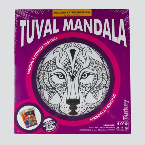Mandala; 30x30 Tuval Üzerine Giydirilmiş Mandala, Farklı Renkte 12 adet Keçeli Kalem bulunur. Mandala Sanskritçe kökenli bir sözcüktür. Çeşitli desenlerden oluşan mandala şekilleri belli bir düzene göre boyamaktır. Genellikle daire veya kare şeklinde olan mandalalar meditasyon nesnesi olarak kullanılabilmektedir. Merkezden başlayarak birbirinden farklı sembollerin bir araya gelmesiyle bütünü oluşturan, bütünü simgeleyen bir desene sahiptir. Kırk bin yıl öncesine dayandığı bilinen mandalanın mağara duvarlarına çizilen resimlerde izine rastlanmıştır. Günümüzde ismi çoğu kişi tarafından bilinmese de gündelik hayatımızda yerini almıştır. En basit örneği kadınlarımızın ördüğü dantel motiflerinde de mandala mevcuttur.