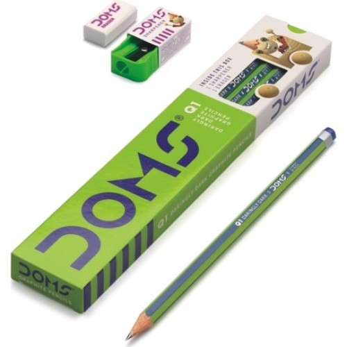 Kutu içerisinde 12 adet Doms Q1 kurşun kalem, dust-free silgi ve kalemtraş. HB dereceli kurşun kalem orta yumuşaklıkta yazar, silince iz bırakmaz. Ağaç cidarlı altıgen gövdelidir. Çocukların kalem gövde ve arkasını çiğnemesine karşı dayanıklıdır, çiğneme esnasında boya gövdeden çıkmaz. Çocuklar için güvenlidir, EN71 testlerinden geçmiştir. |