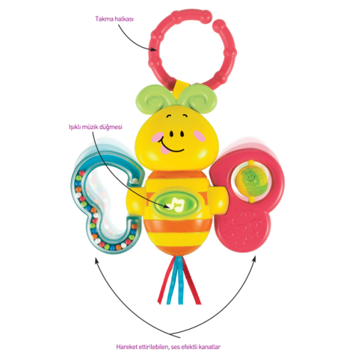 Minik parmakların kolayca basabileceği şekilde tasarlanmış ışıklı ve müzikli düğmeleri, ses efektli kanatlarıyla benzersiz bir eğlence sunuyor. Dişlenebilecek kısımları da tam kaşınan dişlere göre!
