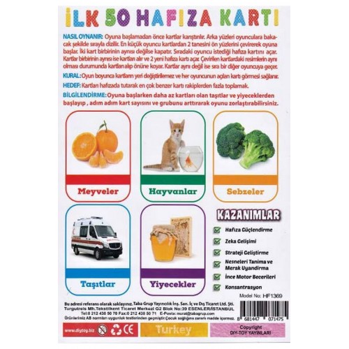Kural : Oyun Boyunca Kartların Yeri Değiştirilemez Ve Her Oyuncunun Açılan Kartı Görmesi Sağlanır. Hedef:Kartları Hafızada Tutarak En Çok Benzer Kartı Rakiplerden Fazla Toplamak. Bilgilendirme. Oyuna Başlarken Daha Az Kartları Olan Taşıtlar Ve Yiyeceklerden Başlayıp,Adım Adım Kart Sayısını Ve Grubunu Arttırarak Oyunu Zorlaştırabilirsiniz. Kazanımlar:Hafıza Güçlendirme Zeka Gelişimi Strateji Geliştirme Nesneleri Tanıma Ve Merak Uyandırma İnce Motor Becerileri Konsantrasyon. İçeriği: Meyveler Hayvanlar Sebzeler Taşıtlar Yiyecekler .