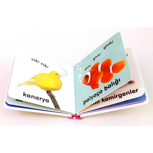 Yumuşacık tüylü köpekler, sevimli tavşanlar, rengârenk balıklar! Bu kitapla bebeğiniz hem pek çok doku ve kavramla tanışacak, hem de ilk kelimelerini öğrenecek. Kalın ve su geçirmez sayfaları, küçük ve ergonomik yapısı ile bebeklerin minik elleri için üretilmiştir.
