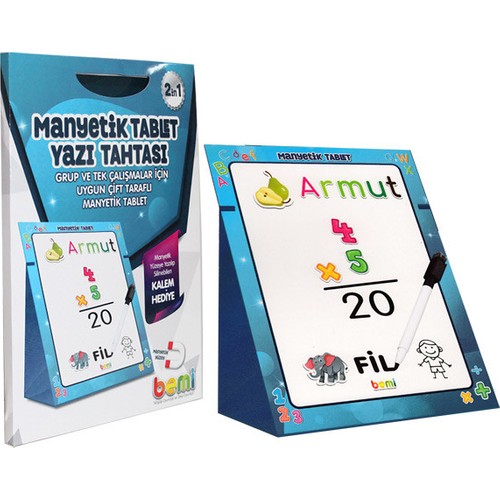 Kutu içeriği: Çift taraflı manyetik yüzeyli yazı tahtası, silgili manyetik kalem.