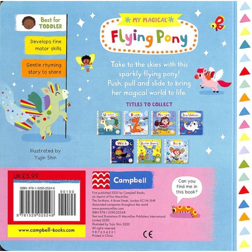Yujin shin's beautifully coloured illustrations are paired with gentle rhyming text to create a perfect flying pony world, with bright, sparkling detail and things to spot in four magical scenes.