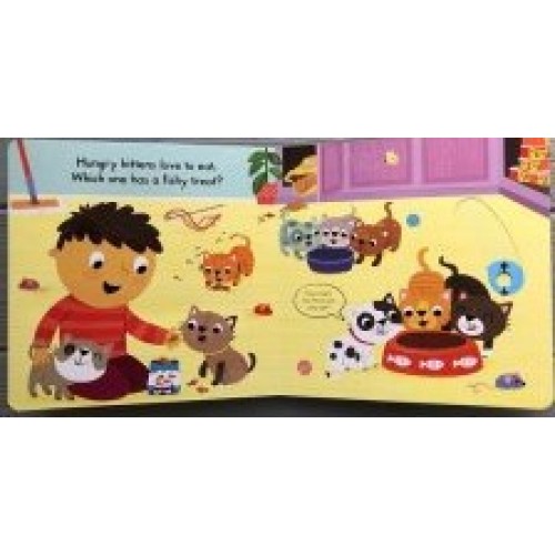 In Busy Kittens, children can have lots of fun pulling, pushing and turning the mechanisms. Join in with the fluffy kittens as they play hide and seek, scamper up trees and lick their food bowls clean.