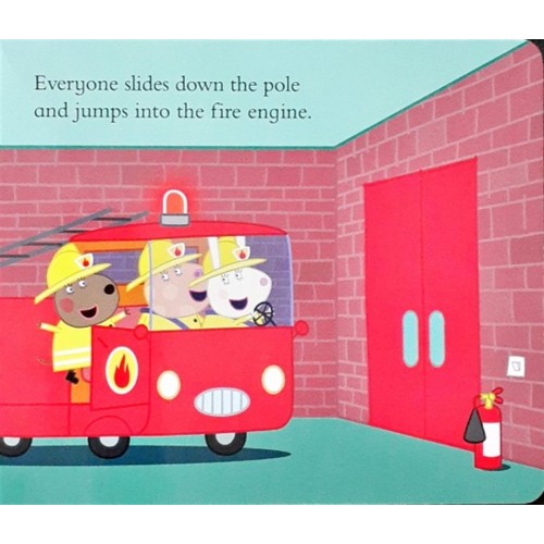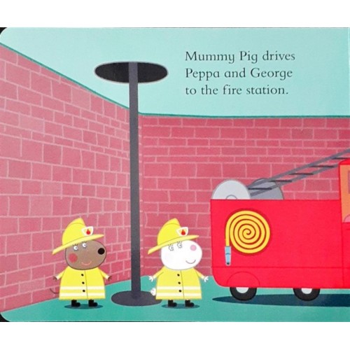 Mummy Pig is taking Peppa and George to the fire station. They are excited to ride in the fire engine and ring the bell.