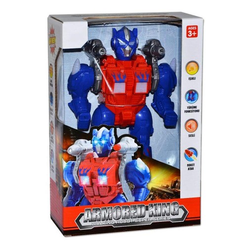 Armored oyuncak robot çalıştırıldığında sesler çıkartarak ve konuşarak yürümeye başlar ve bir ara durur ve füzelerini fırlatmaktadır.
