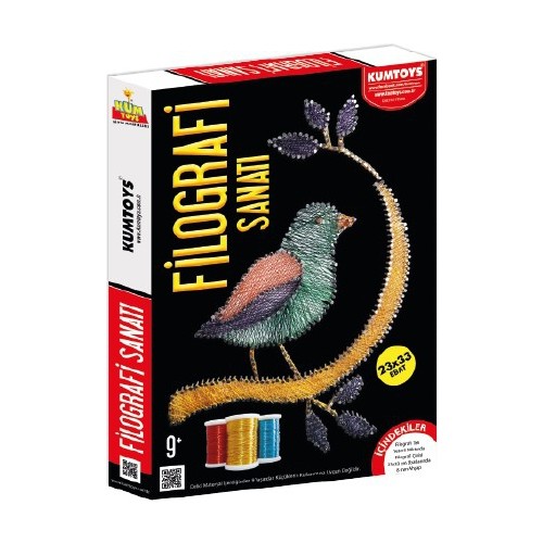 Orta Doğu’da doğup tüm dünyaya yayılmış olan filografi sanatı, çocuk ve yetişkinlerin keyifli vakit geçirmesini ve el becerilerinin gelişmesini sağlıyor. Tahta üzerinde çivi ve teller yardımıyla farklı motif ve desenlerin oluşturulması olarak tanımlanan filografi, hayal gücünün gelişmesine de katkı sağlıyor. Filografi sanatında renkli tellerle farklı örme teknikleri kullanılarak isteğe göre hat yazıları, şekiller, çiçekler, hayvanlar ve çizgi karakterler gibi desenler ahşap panolara işleniyor. Kumtoys filografi sanatı, çocuk ve gençlerin filografi tekniğini öğrenmesini kolaylaştıracak şekilde tasarlanmış olup ihtiyaç duyulan tüm materyalleri bir arada sunuyor. Kumtoys filografi seti, ahşap zemin üzerinde motif işaretli şekilde geliyor. Filografi setinin içinde işaretli motifin içinin doldurulması için çok sayıda renkli filografi ipi ve yeterli sayıda çivi yer alıyor.
